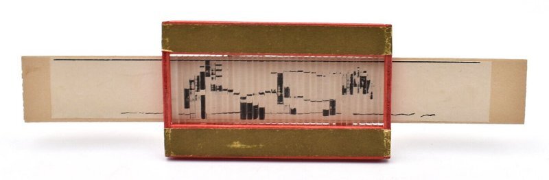 This is a most unusual toy. There are two key elements: a viewing implement and 38 cardboard strips, about 11⅜" x 1½". The implement is a sliding wooden frame with a channel perfectly matching the width of the cardboard strips. Above this channel are perhaps forty plastic or glass rods that refract the images passing below them. The hoped-for result is that the images, otherwise hard to decipher, become movie loops, showing a repeated action. Though the package mentions La Fontaine fables, I can find only two that I recognize: GA and LM. Other strips that take on a life for me are a tightrope walker; a train; and a dog chasing a man. It is quite possible that I have not mastered the right speed for moving the strips underneath the frame. I would say that this is a very creative idea that did not quite get worked out fully. - Date