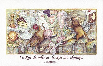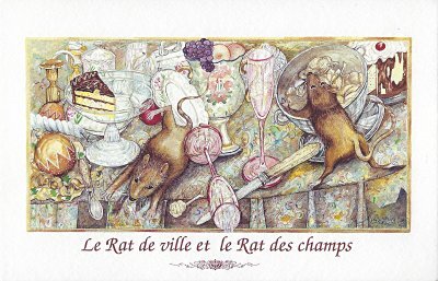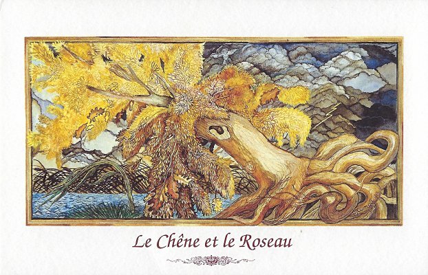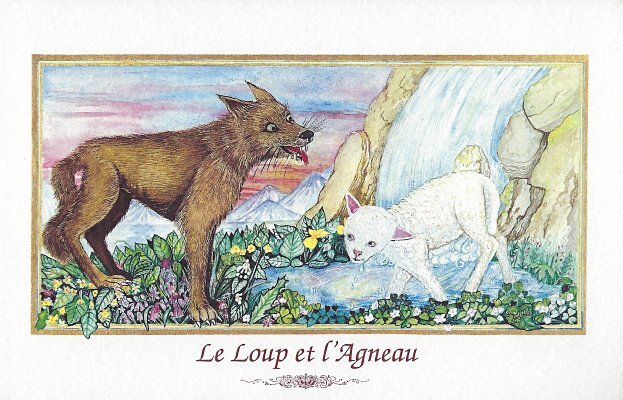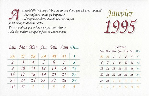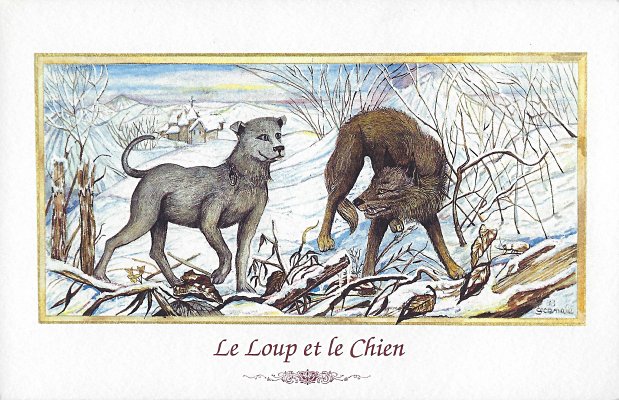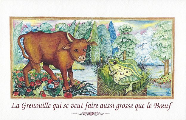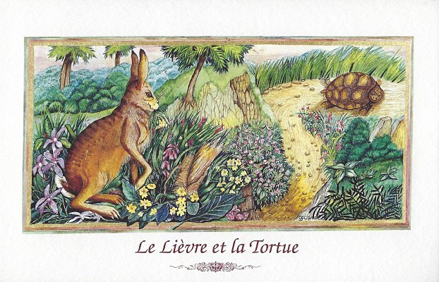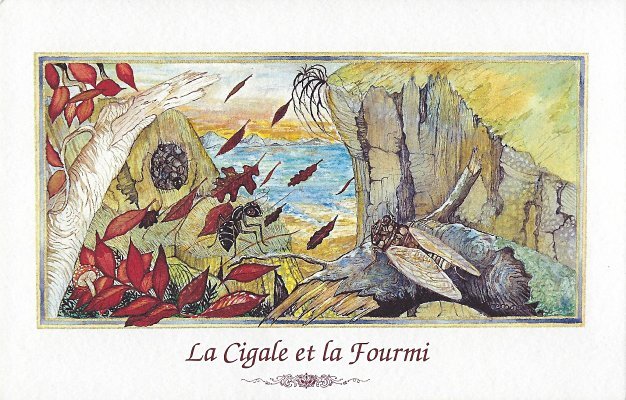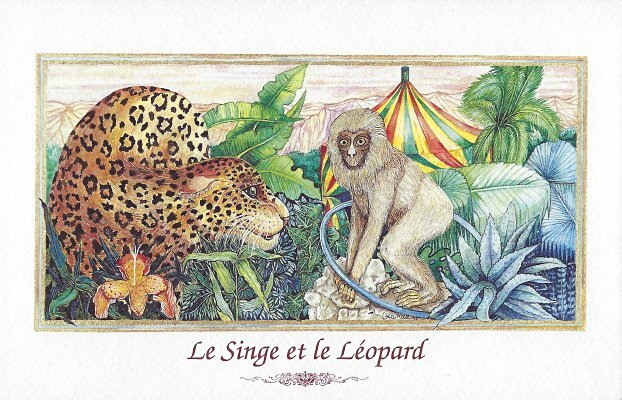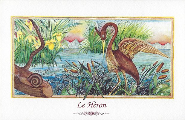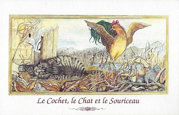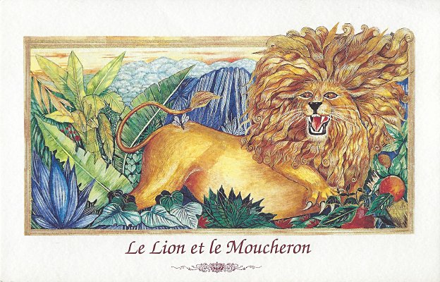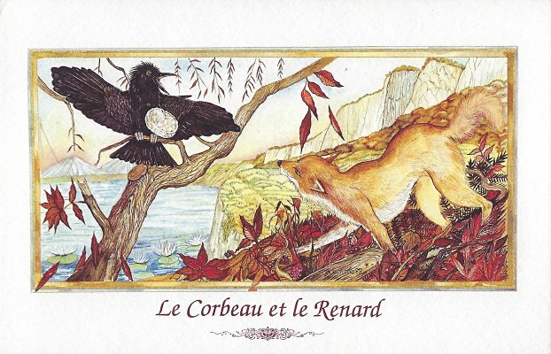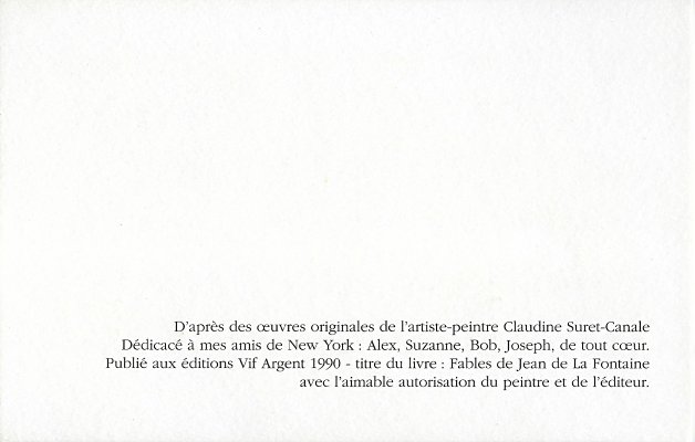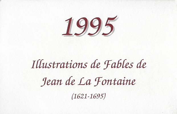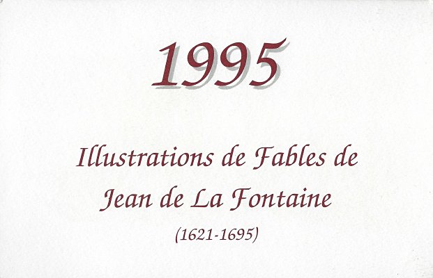 1995 "Illustrations de Fables de Jean de La Fontaine (1621-1695)." Thirteen calendar cards after the paintings of Claudine Suret-Canale originally published in 1990 by Vif Argent in "Fables de Jean de La Fontaine." 60 from Bertrand Cocq, Calonne Ricquart, France, August, '18.