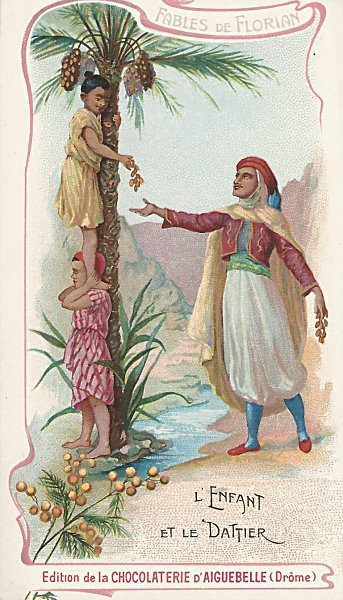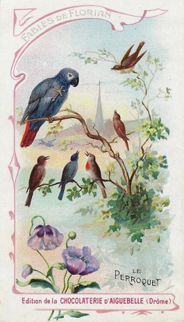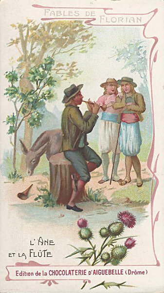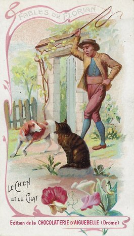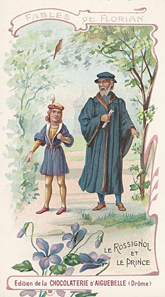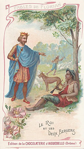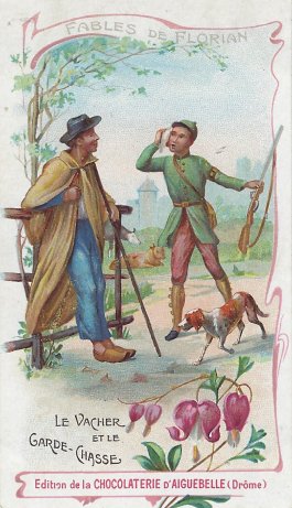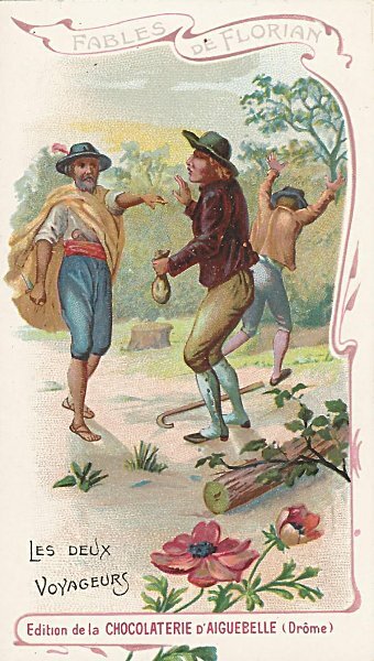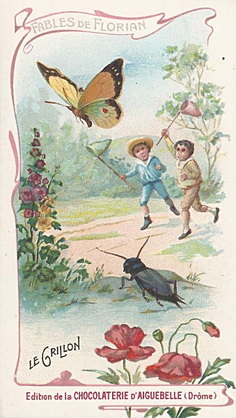 1890? 6 full-color portrait-formatted French cards featuring fables from Florian. 4½" x just over 3½". "Edition de la Chocolaterie d'Aiguebelle (Drôme)" on both sides of each card. Jacques Lehuard, Jonquieres St. Vincent, France, Feb., '08. Extras of "Le Grillon" and "Le Roi et les deux Bergers" for $6 each from Bertrand Cocq, Calonne-Ricouart, France, March, '01. Extra copy of "Les Deux Voyageurs" for €5 at St. Ouen, June, '19. Four further cards for €9 each from Albert van den Bosch, Antwerp, June, '23.