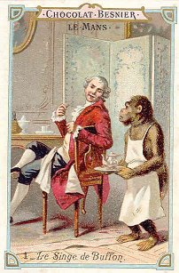 1890? 1 French card, "Le Singe du Buffon," from Chocolat Besnier, Le Mans. Just over 2¾" x just over 4". Lith. Parisienne, Rue Courbeau, Paris. Unknown source, August, '01.