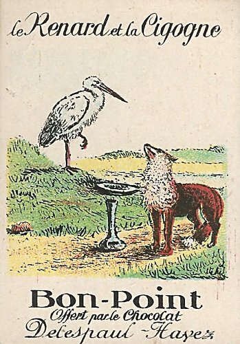 This series of four cards is among the smaller but more nicely done cards that this collection has. The four images are well done. The picture side of the card includes a fable title at its top, a colored image, and then three lines of advertisement: Bon-Point, Offert par le Chocolat, Delespaul-Hayez." The verso is identical on all four: Chocolat Corona Delespaul Havez: Le Meilleur Chocolat pour votre Gouter. Exigez-Le!!" FS; WL; "The Hare and the Frogs"; and "The Old Woman and Her Two Servant-Girls." - Date