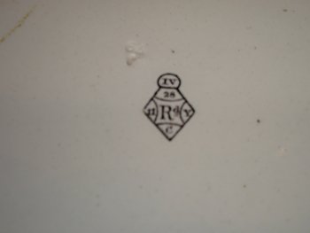 The emphasis in this strong illustration is on the match between the aggressive dog with a chop in his mouth and the reflection in the water, beautifully positioned along the rim between the center and outside of the plate. The title makes its way toward the center of the plate from about 11 o'clock. On either side are branches with leaves and blossoms. Would this plate have been colored in some versions, like the plate of FS? There is a curious burn in the finish of this plate around 7 o'clock. The "Rd" of the trademark is here surrounded, clockwise from the top, by 28, Y, C, and 11, with IV over the whole mark. - Date