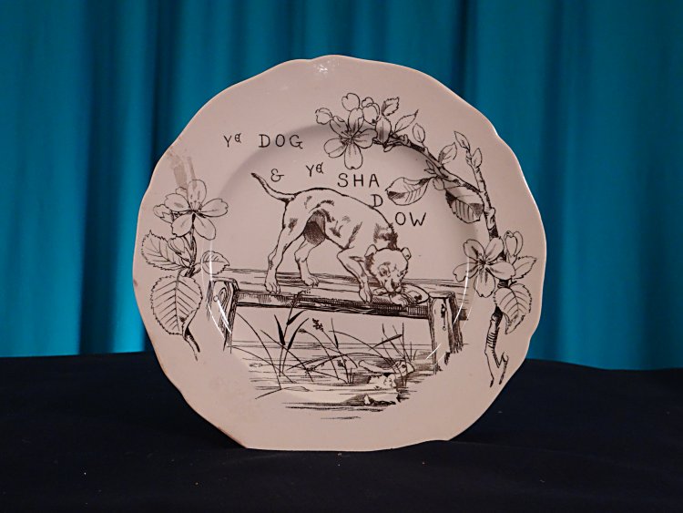1880? One black-and-white DS plate. 10¼" in diameter. Slightly scalloped rim. "Ye Dog and ye Shadow." $14.99 from Nancy Wolf, Brookfield, WI, through eBay, Oct., '06.