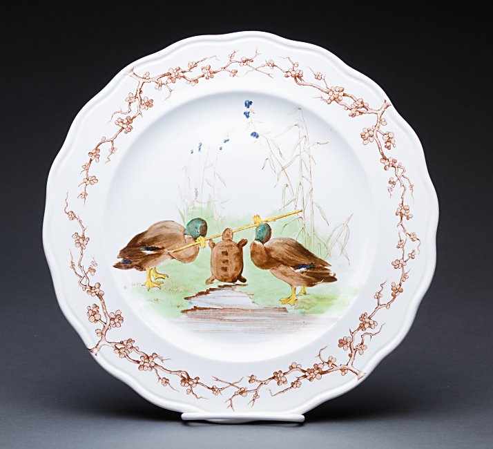1880? One white-colored plate with a multi-colored illustration of TT in the indented center of the plate. Around the outside of the plate run four vines; their stalks are at about 1:30, 4:30, 7:30, and 10:30.