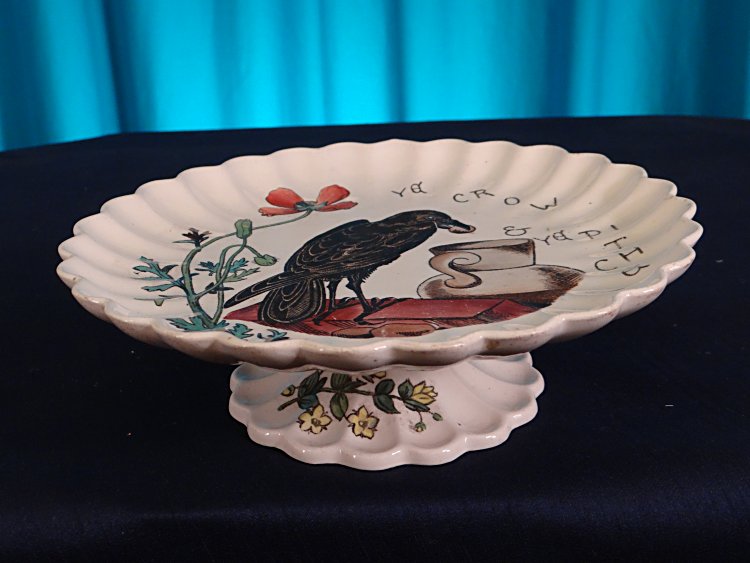 1880? One colored FC cake pedestal. 8½" in diameter. About 2¾" high. Sculpted rim on both the stand the plate itself. "Ye Crow and Ye Pitcher." From an unknown source.