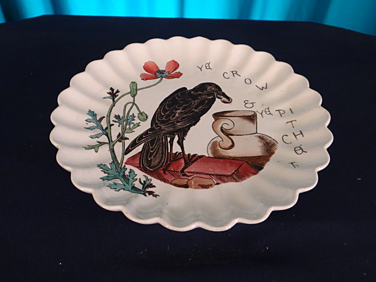 This is a lovely piece of work. The black crow stands out in the center of the plate with a stone in his beak. Next to him is a red flower atop a green stem. The crow is perched on a red and brown surface and is ready to drop the stone into a gray vase. "Ye Crow and Ye Pitcher" runs from 12 o'clock to 4 o'clock. The base has an attached label: "28 Jan. 1879." The "Rd" of the trademark is here surrounded, clockwise from the top, by 28, Y, C(?), and 11, with IV over the whole mark. Very nice color work here! - Date