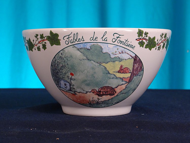 - A handleless bowl 6" across featuring TH with the first two verses of the fable. The tortoise is about to pass a "5" milepost.