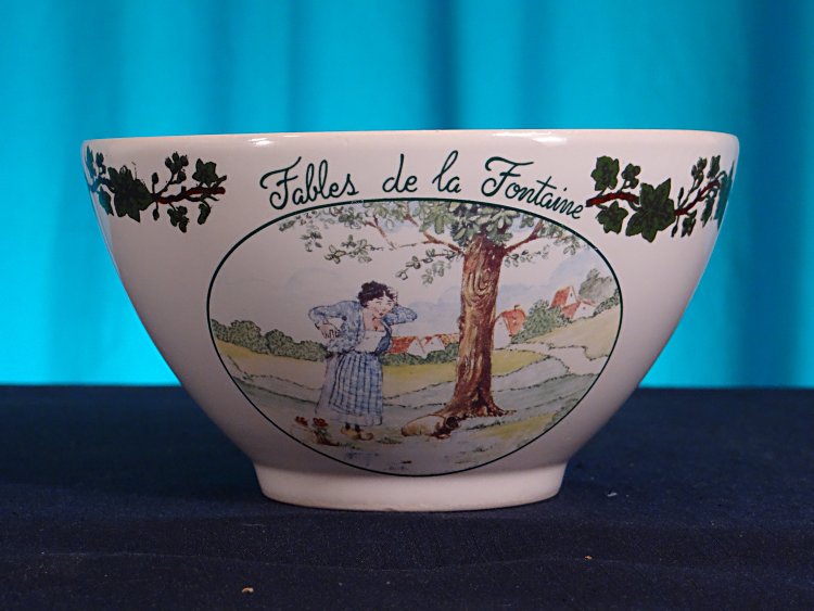 - A handleless bowl 6" across featuring MM with four verses asking who of us does not build castles in Spain. Perrette holds her head in horror as she looks down at the dropped pitcher and the spilled milk.