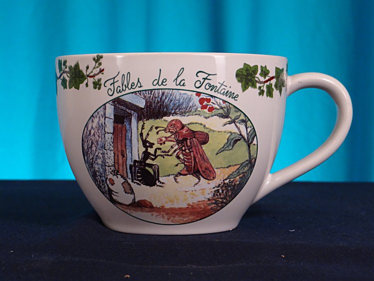 - A handled cup 3 ½" high, 4 ¾" across the cup, and 6" across if one includes bowl and the handle. It features GA with the last two verses of the fable. The ant and grasshopper are distinctive in their black and brown colorings, respectively. One extra exemplar. Also one MM cup, illustrated like the bowl above.