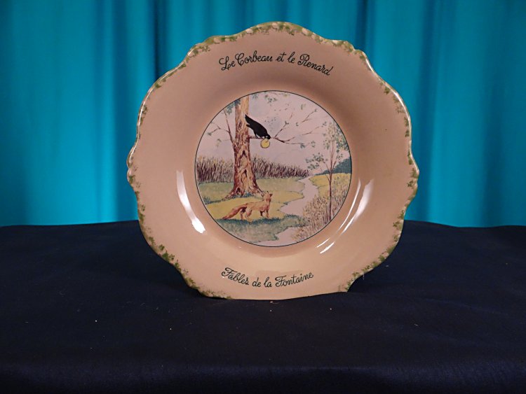 1920? Ceramic plate of FC by "Jars, France pour F & S." 10" in diameter. Scalloped rim. Tan with green edging, script, and illustration border around a circular full-color illustration of FC. "Le Corbeau et le Renard" and "Fables de la Fontaine" on the plate front. $5.95 from Charles W. Turner, through eBay, June, '04.