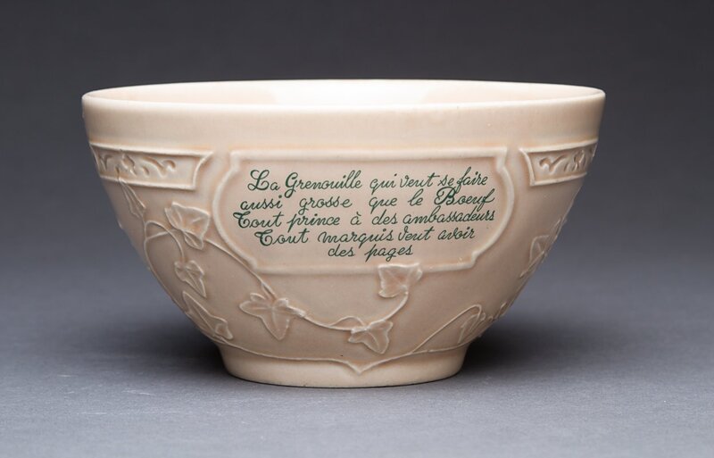 A handleless bowl 6" across featuring OF. On the opposite side there is a panel with the fable's title and moral in cursive. Around these two elements are a raised unpainted floral pattern.