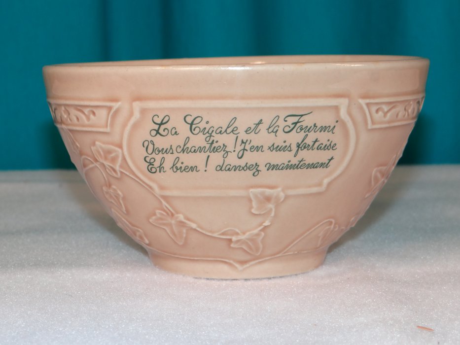 A handleless bowl 6" across featuring GA. On the opposite side there is a panel with the fable's title and moral in cursive. Around these two elements are a raised unpainted floral pattern. $15 from kalo*cstle through Ebay, Nov., '18.