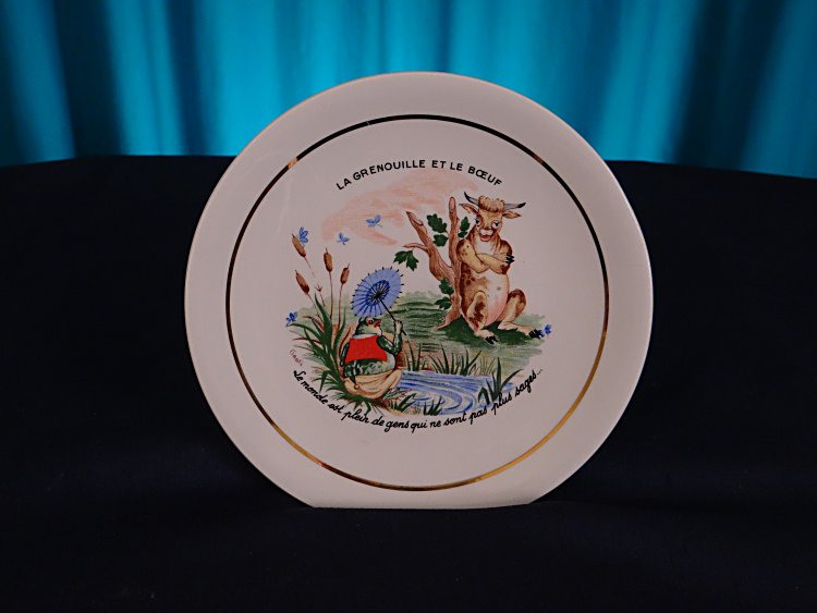 - The frog here carries a parasol and wears both a vest and britches. The ox, sitting in human fashion, looks on amused with his arms crossed.