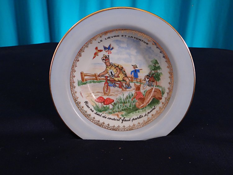 - The sweating tortoise in TH rides a bicycle and wears a rider's cap and sneakers. The hare also rides a bicycle and has goggles above the brim of his cap.
