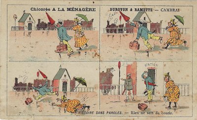 1910? Trade card of Chicorée à la Ménagère. "Rien ne sert de courir." Duroyon & Ramette - Cambrai. "Histoire sans Paroles." $6 from Bertrand Cocq, Nov., '20.
