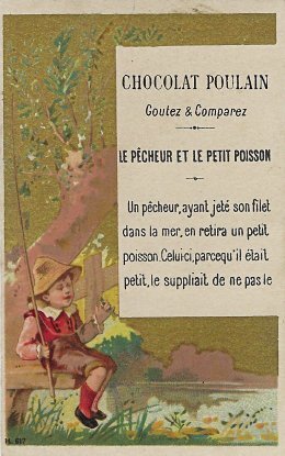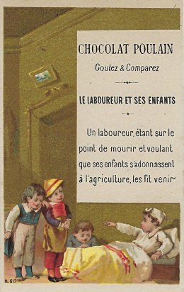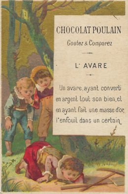 1910? Four trade cards advertising Chocolat Poulain. H. 217. Gold background. Children pictured in a painted scene from a La Fontaine fable. €20 in St. Ouen, June, '19. "Miser" for €5 from Simon Rodrigues through Ebay, June, '22.