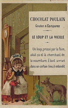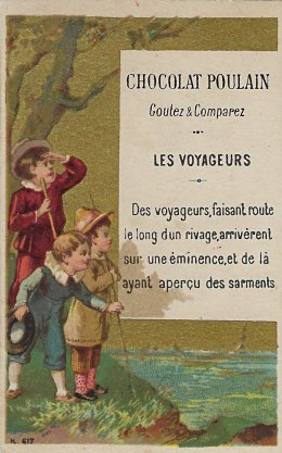 The scenes look familiar, even though they occupy only about 60% of the front of the card. The rest is "Chocolat Poulain: Goutez & Comparez" along with the title and first 25 words or so of the fable, presented in prose. I continue to struggle with the taste that has a male child acting the role of the dying father entrusting his treasured land to his children, or a female child acting the "old woman" here – elsewhere she is a nurse or mother – threatening to give the child to the wolf. The fable of the "travelers" here is the story of seeming to see a ship from afar that turns out, on closer inspection, to be some floating sticks. The verso repeats the beginning lines from the front, complete with a moral. - Date