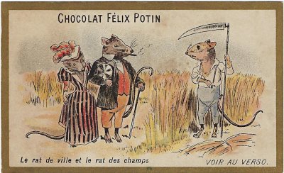 This card seems so similar to many series we have found, yet I cannot connect it to any. The illustrated scene is quite original, since the town mouse appears with his wife or girlfriend, in lovely period costume. The town mouse seems surprised to find his cousin smoking a cigar in his field - Date