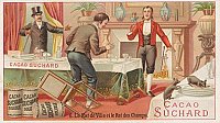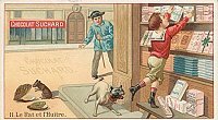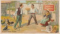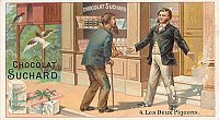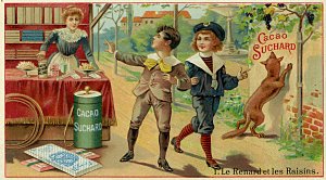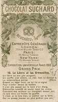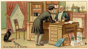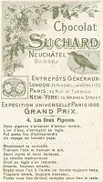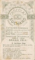 These small landscape-formatted cards offer beautiful colored pictures of human scenes exemplifying animal fables. The picture-side includes "Chocolat Suchard," a number up to 12, and a title. The verso, sometimes showing a glue-tear, comes in four different patterns. In each of the patterns, a title and excerpts from the fable occur beneath an elaborate monocolor floral or animal background, "Neuchatel, Suisse," and mention of London, Paris, and New York offices. The addresses are the same in each format. Each format also mentions "Exposition Universelle Paris 1900 Grand Prix." The colored illustration cleverly includes both the animal scene and some Suchard product into the human scene. Even a bridge and a road bear the Suchard name! Do not miss in "Les Deux Coqs" the dramatic confrontation of two men in the farmyard, while a young woman looks on. The joker in FC is about to lure the Suchard chocolate from the vain dandy who carries it. The scene in "Le Rat et l'Huitre" is complex. A boy stealing packages of Suchard chocolate is about to experience the jaws of an attacking dog, just as the rat probing an oyster is about to have the oyster snap shut on his or her head! - Date