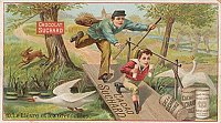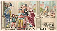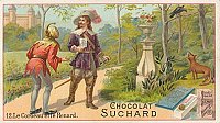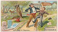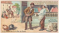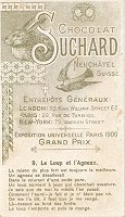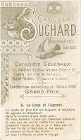 1905? 12 numbered French cards of La Fontaine fables from Chocolat Suchard. 2 3/8" x slightly more than 4". $63 from Marie Foreman, Hamilton, Ontario, Canada, through Ebay, Feb., '02. The last two cards for $10 from Albert Van den Bosch, Antwerp, Belgium, April, '13.