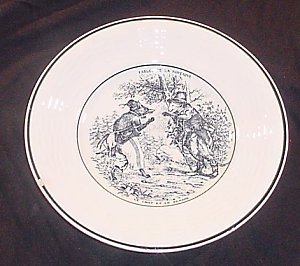 1930? 7" white plate from Sarreguemines, France. Inside a 1.5" rim there is a portrayal of "The Fox and the Cat." The front carries two inscriptions: "Fables de la Fontaine" and "Le Chat et le Renard." The back has, in sketchy form, "Fables de la Fontaine" and "Digoin/Sarreguemines/France." $23.49 from Lea Belew, Beeville, TX, through Ebay, Oct., '00.