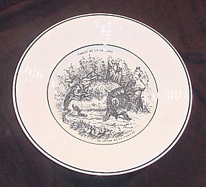 1930? 7" white plate from Sarreguemines, France. Inside a 1.5" rim there is a portrayal of TH. The front carries two inscriptions: "Fables de la Fontaine" and "Le Lievre et la Tortue." The back has, in sketchy form, "Fables de la Fontaine" and "Digoin/Sarreguemines, France." $20 from Dany Wolfs, Roesalare, Belgium, Sept., '00. One extra exemplar.