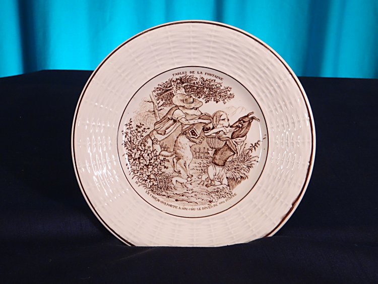 1930? 7" white plate from Sarreguemines, France. Inside a 1.5" rim there is a representation of Grandville's "The Dog Carrying His Master's Dinner." The front carries two inscriptions: "Fables de la Fontaine" and "10. Le Chien Qui Porte a Son Cou le Diner de Son Maitre." The back has a "Digoin" stamp.