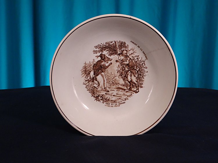 1930? 7¼" white bowl from Sarreguemines, France. 1.5" deep. Inside the bowl there is a brown adaptation of Grandville's "The Cat and the Fox." The front carries two inscriptions: "Fables de la Fontaine" and "1. Le Chat et le Renard." The back has the usual Digoin stamp. From an unknown source before 2006.