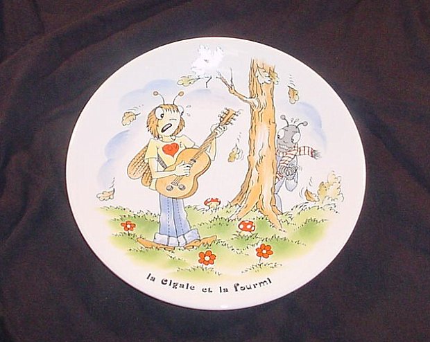 - La Cigale et la fourmi Apparently we are in the fall. The ant in his scarf is rubbing his hands behind a tree, as leaves fall from the tree. I think the artist's intent here is to have the ant cold in his winter clothes, while the cicada is still doing fine in his light clothes. In any case, this cicada is a hippy with "Love" on his t-shirt and long hair on his head.