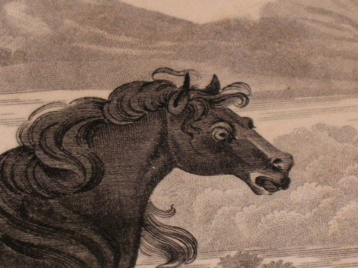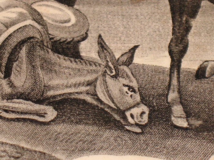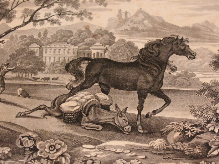 This platter is done in the relatively rare black style. Barbara gave it to me in honor of her deceased husband Stanley, who carried the large platter back in his lap as he returned by airplane from Barbados. Barbara had taken the platter to the Antiques Road Show, where the antiques expert mentioned the particularly fine rendition of the horse and the relatively rare black. She valued it at $250. I wonder if it belongs to Spode's original "Aesop's Fables" series, apparently issued in 1831. The fable is apparently Perry #181. I present here Babrius #7, which seems to be the first to do the fable exactly this way: A man had a horse which he used to lead along with him free of any burden. He put the burden upon an aged ass. So the latter, worn out by much toil, went up to the horse and spoke with him about it: “If you are willing to share a part of my load, I may, perhaps, come through alive, but otherwise I shall die.” “Go along," replied the horse, “don't bother me." The ass plodded on in silence, but presently, spent with toil, he fell down and lay dead, as he had foretold. Immediately the master drew up the horse beside him and, unfastening the entire load, put upon the horse not only the packsaddle of the poor drudge, with all its burden, but in addition also, after flaying him, the ass's skin.” Alas," said the horse, “how poor was my judgment; that very burden, of which I was unwilling to share even a small part, has now of necessity been put upon me in its entirety." - Date