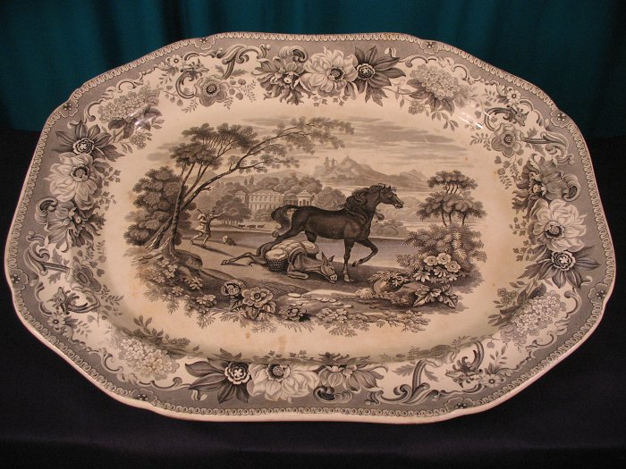 1831? A serving platter, 20¼" x 15½", showing "The Horse and the Loaded Ass." "Aesop's Fables." Spode. England. Gift of Barbara Markuson, Glenwood, IA. August, '10.