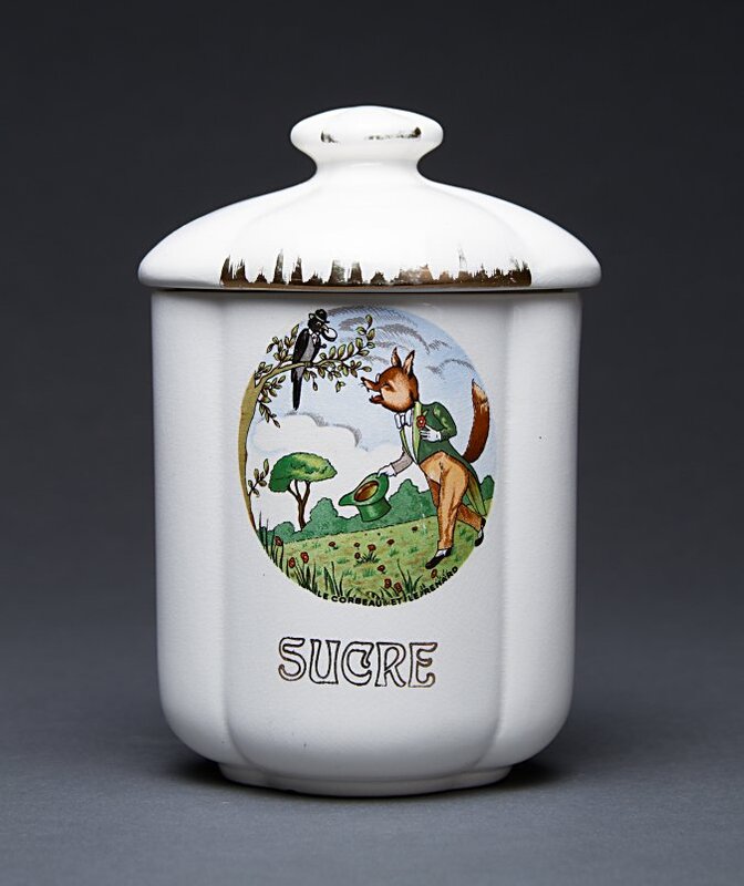 Here are two ceramic kitchen storage canisters, each with a fitting lid. Unfortunately, there seem to be no markings identifying the manufacturer. The "farine" (flour) canister is slightly larger: 4¾" x 4" across the open top and 5¼" high to the top of the lower portion, but 8" to the top of the whole jar. The "sucre" (sugar) canister is 4¼" x 3½" across the open top and 5" high to the top of the lower portion, but 6¾" to the top of the whole jar. "Farine" sports a WL cartoon identical with that on a teal-bordered serving plate in the same series. "Sucre" has the same WL cartoon as the cartoon on a serving plate in the same series. - Date