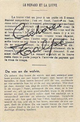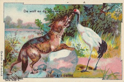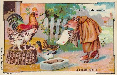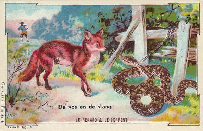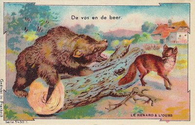 These cards have three identifying characteristics: (1) the "Chicorei Talpe" written across the French text on the verso; (2) the unusual instepped borders, hard to describe but easy to notice; and (3) the "5430" series indicated in the lower left. Here we have five of the -- apparently -- six in the series. The good news for this collection is that we have a set of five cards in a "5430" series under "Fable Card Series." The lacking number there (#1) is present here: "Renard and the Bear." The lacking number here (#5) is present there: "The Horse and the Wolf." There is also a single card in this format under single stock trade cards, picturing the fox and the snake. As I mentioned a propos of "5430," there is very nice chromolithography on these cards. 4" x 2¾". Chicorei Talpe was produced in Roeselare, Belgium. - Date