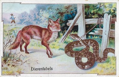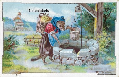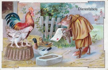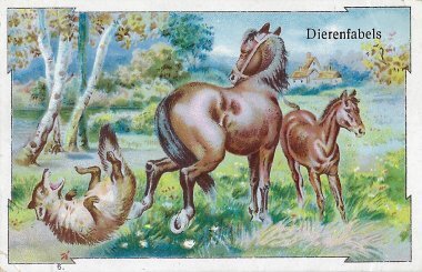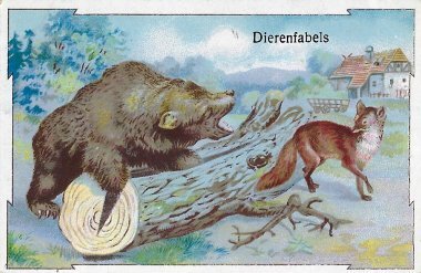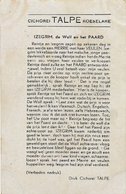 These cards have the same images as cards in two other sets in our collection: "Chicorei Talpe" and "5430." Like the cards in those sets, these cards have an unusual border shaped on each side by a zagged line. This is a complete set of six, whereas each of those is lacking one of the six. These cards are also formatted differently on their front, each having only "Dierenfabels" to complete the image. Finally, the verso lacks the bold script "Chicorei Talpe" written across the upper text on the verso. The verso of each card also identifies Roeselare as Talpe's home. By contrast with those cards, there is no numbering on these six cards. 4" x 2¾". - Date