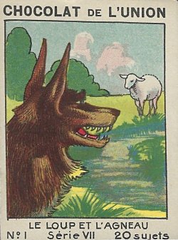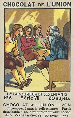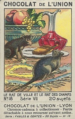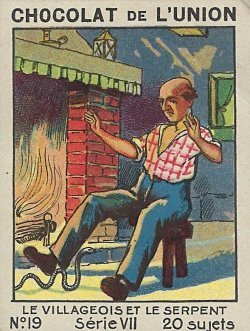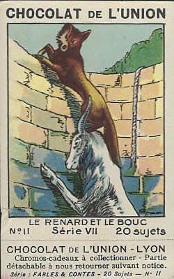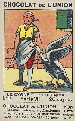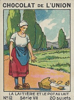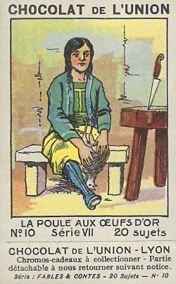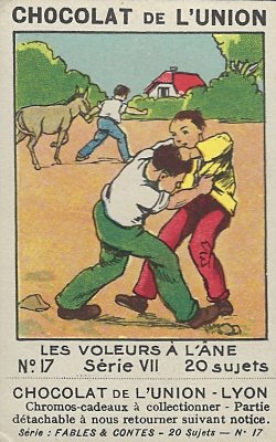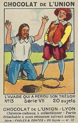 1900? Thirteen – out of a numbered series of 20 – small (about 2" x 3") cards by "Chocolat de L'Union" in Lyon. Each is labelled as a "Chromo-Cadeau." One extra of #20, "Cobbler and Financier." $5 each from Bertrand Cocq, Calonne Ricouart, France, Sept., '20.