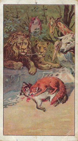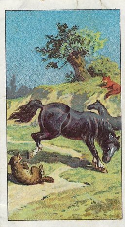 This small set catches one of the "fable" elements in this Dutch rendition of the Renard story, the horse's outwitting of the wolf. Renard's conquest of the wolf is quite graphic at the end of the series! - Date