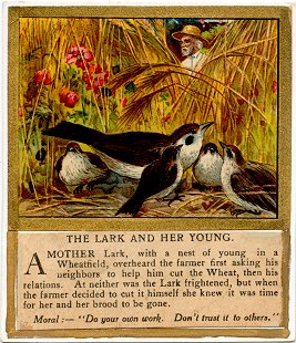There have been other collectors as crazy as I am. This collector took a lot of time. First, the collector found two of every card. Secondly, she or he cut the text portion (title, fable, and moral) from the back of one of each pair and, thirdly, pasted both picture and text onto a new and slightly larger card. Finally the collector used a brush or pen to extend the golden stripe around the now lower text portion. Doris offered six loose cards on Ebay, and our contact led to my purchasing the whole album. We collectors can be a strange lot! - Date
