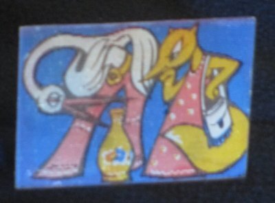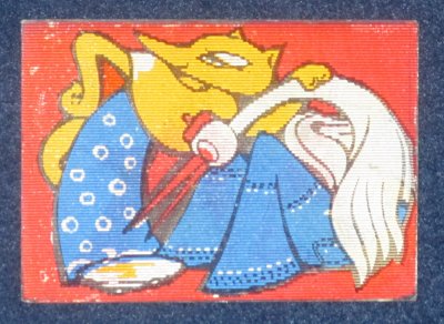 Here is one of the more unusual items in the collection. The picture side of this stiff card shows a different picture depending on which angle one uses to view it. I am not sure that "stereotype" is appropriate but the word signals at least the double views. The approach is excellent for this fable's two phases: the clever fox prevails, and then the cleverer stork repays. This fable seems to have entered Russian culture as a popularly repeated and developed folktale. The seller mistook the multiplication table on the opposite side for a calendar. A calendar would have helped in dating this unusual item! - Date