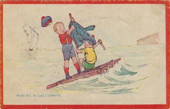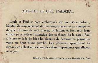 1920? "Aide-toi, le ciel t'aidera." Card showing two boys on a raft. Librairie d'Education Natinale, Paris. $6 from Bertrand Cocq, Nov., '20.