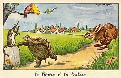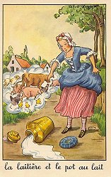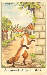 1960? 17 cards each illustrating in full color one fable of La Fontaine. Each is signed "Calvet-Rogniat." 3½" x 5½". Paris: Editions Educatives. Set for $100 from Alexandre Przopiorski de Cay, Lyon, France, June, '00. Five cards, including FG, for €5 apiece, from Brie Comte Robert at the Paris Post Card Exhibit, Jan., '05. Four cards from Elizabeth Sagar, including the new "Monkey and Cat," for £5 through eBay, May, '12. Extra of FG for €4 from Recto-Verso, Strasbourg, July, '19.