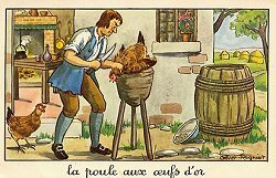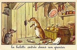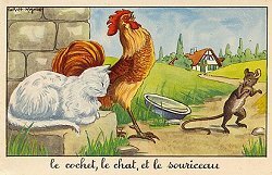 Strong, colorful presentations of the fables. The picture side includes the large illustration and a title beneath. The verso contains the title again, the text of the fable, La Fontaine's name, and the "Editions Educatives: Paris" logo. I enjoy the expression on the face of the bumpkin fisherman (note the striped stockings) as he hauls in his little fish. Also well portrayed is the greed of the man in GGE. The illustrator represents the notion of "belling the cat" physically by having the chief rat hold a bell. He interprets the scene very well by having all the rest of the mice march away. It may be hard to believe that the weasel got into the granary through that very small hole! - Date