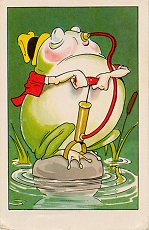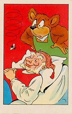 These cards are divided into stories, with as many as twelve cards going to one story. Four titles (Danish, English, German, and French) at the top of the card introduce four brief texts in verse. The stories include various types, including Aesopic fable: FG (#13-18), BW (#19-25), "The Fox, the Lamb, and the Little Mouse" (#39-44), FS (#66-72), DS (#101-107), WL (#108-114), FK (#115-121), "The Bad Turn" ("The Bear and the Gardener," #121-128), "The Porcupine and the Hare" (#129-140), "The Mouse in the Cream" (#148-153), and OF (#197-200). Here the hare races a snail (#7-12). The frogs wanting a king appeal to King Lion. The bear that ends up killing the gardener is a young bear. "The Wolf and the Leg of Pork" (171-77) either is a fable or easily could become one. 1¾" x 2¾", with simple, colored cartoon-like illustrations. Here are two great scenes. The first (#126) shows the bear about the "protect" the gardener from the fly that bothers him. The second (#199) shows the frog blowing himself up to be as large as the ox. - Date