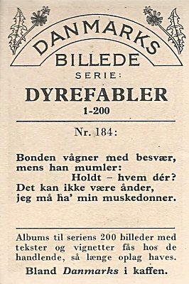 1953 "Danmarks Billede Serie: "Dyrefabler 1-200." 39 cards out of a numbered set of 200. 1¾" x 2¾". $5 from Allen Sweet, Watkins Glen, NY, through eBay, Nov., '12.