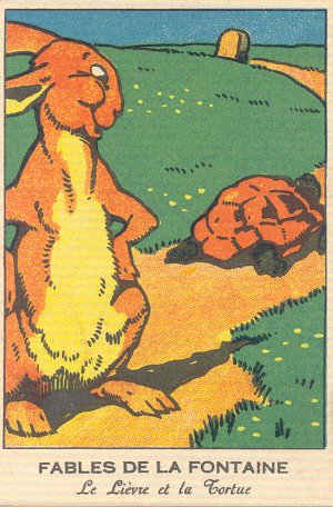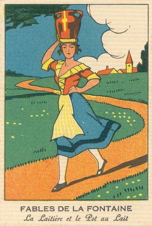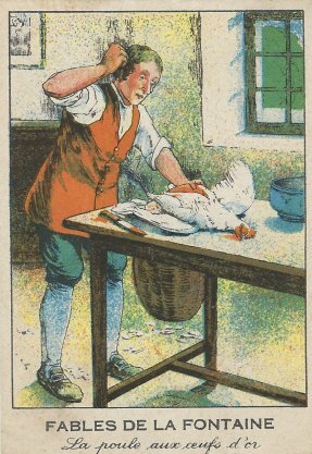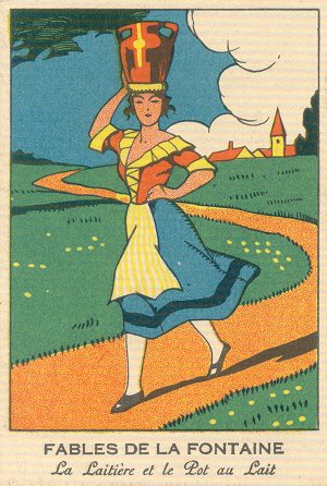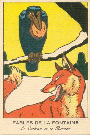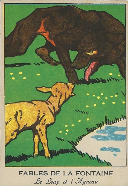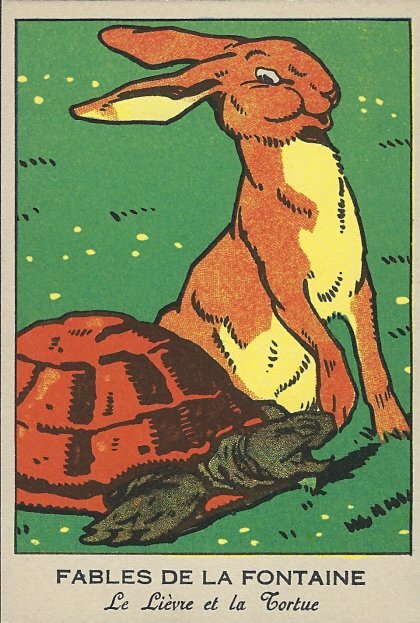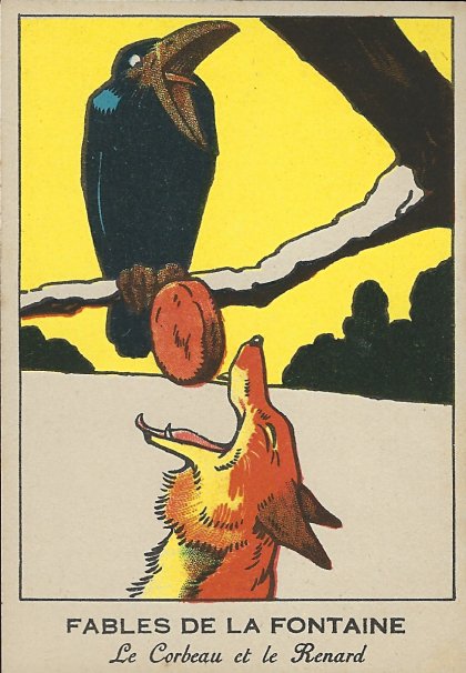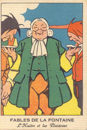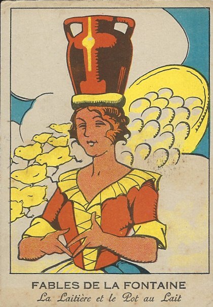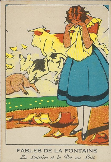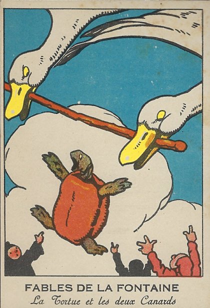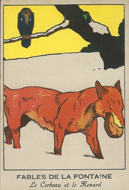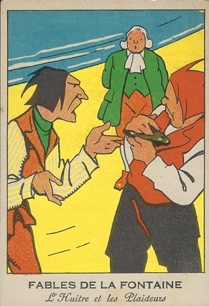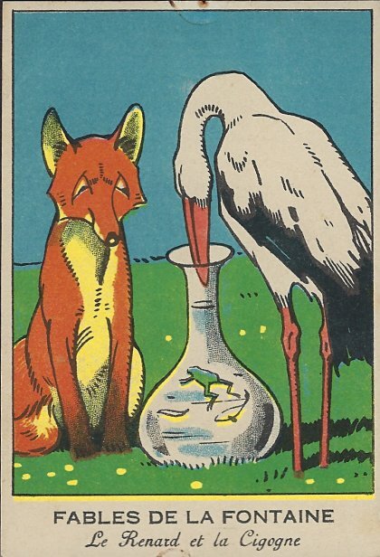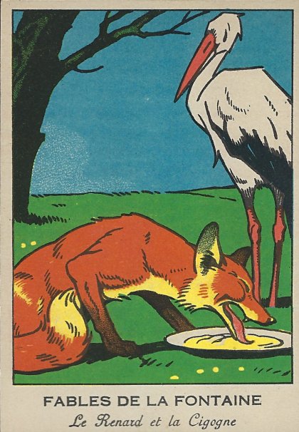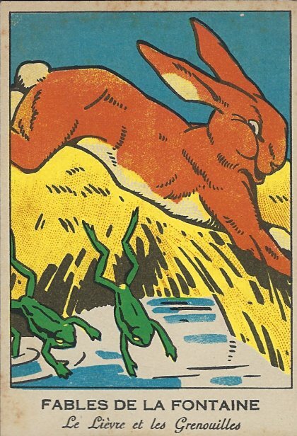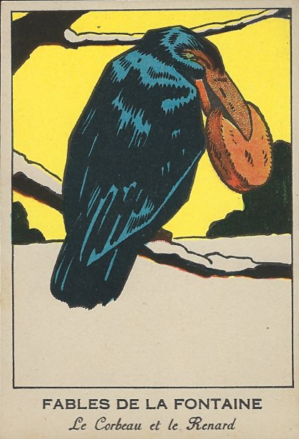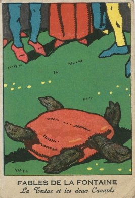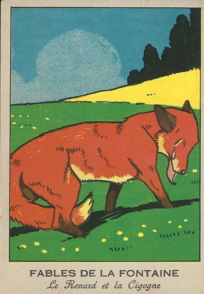 1960? 6 cards each illustrating in strong, simple color one fable of La Fontaine. 3¼" x 4¾". €3 each from Jacky Mabilat, Boutigny sur Essonne, at the Paris Post Card Exhibition, Jan.,' 05. GGE and TT for €10 from Albert van den Bosch, Antwerp, June, '23.