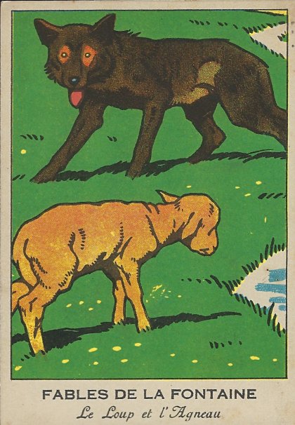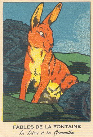 These are simple, strong presentations of the fables. The picture side includes the large illustration, "Fables de la Fontaine," and a title beneath. The verso contains the title again and the text of the fable. Simple forms and dramatic action are the chief qualities here. - Date