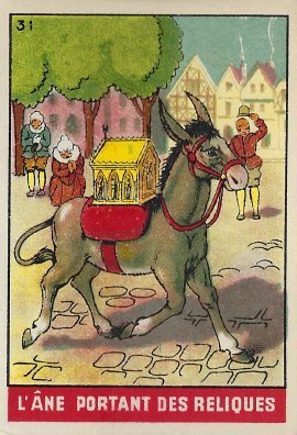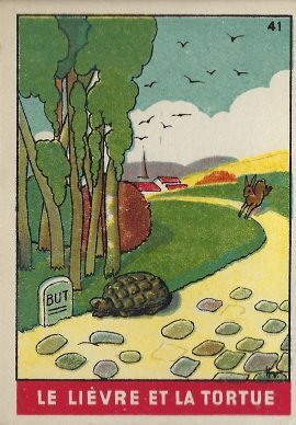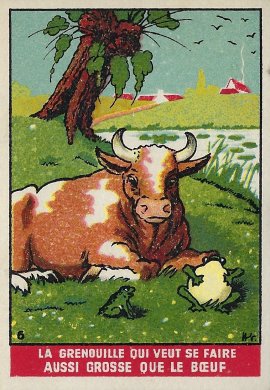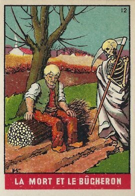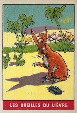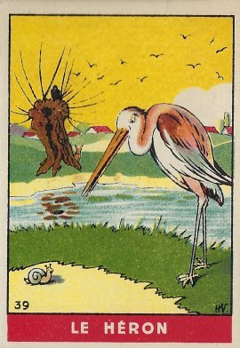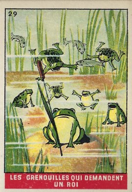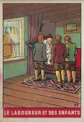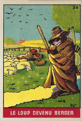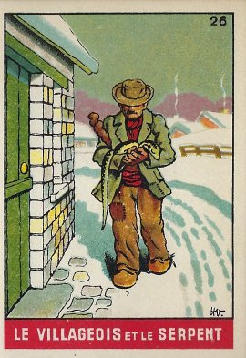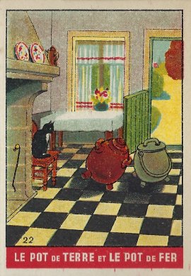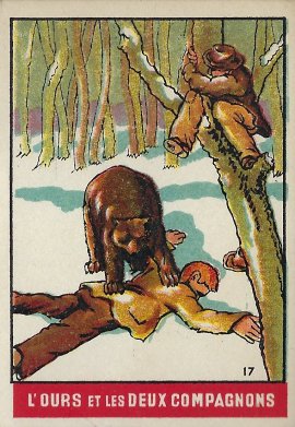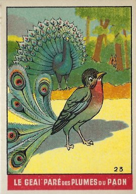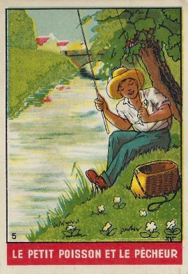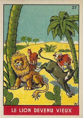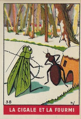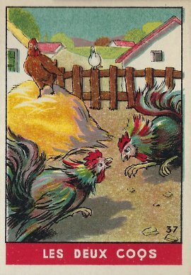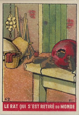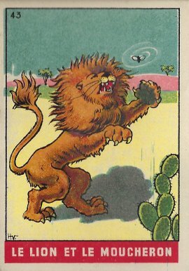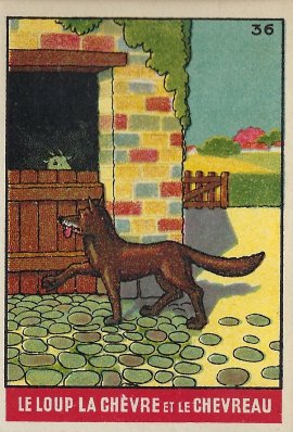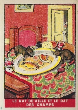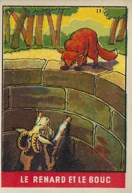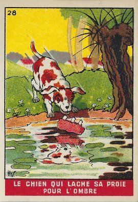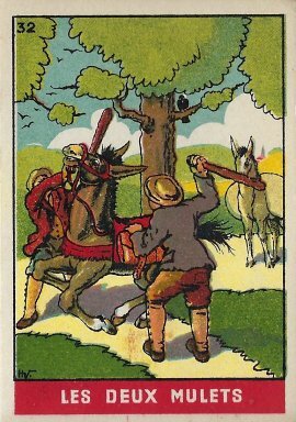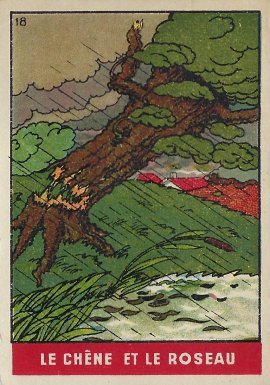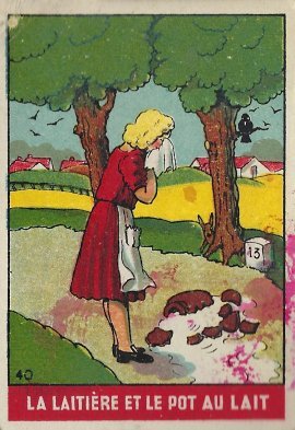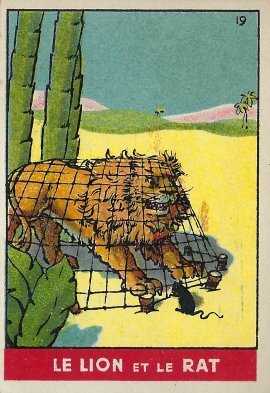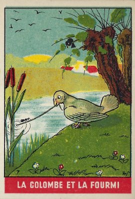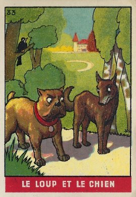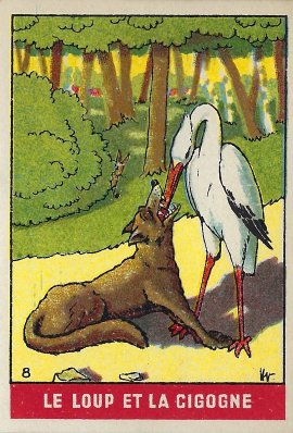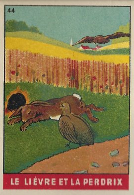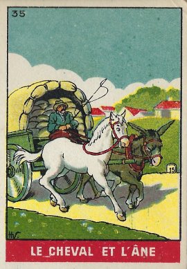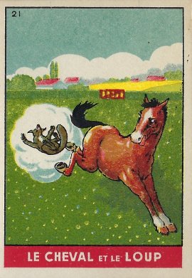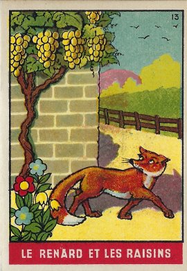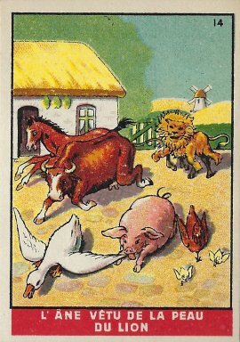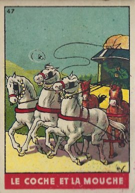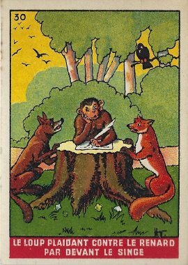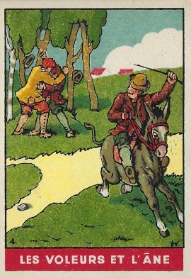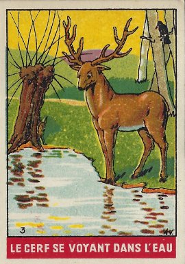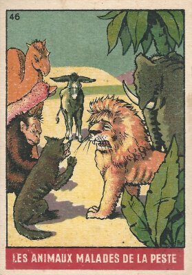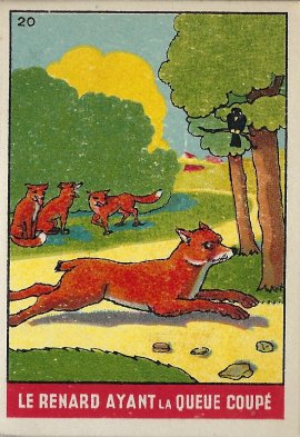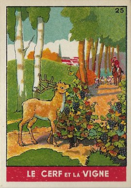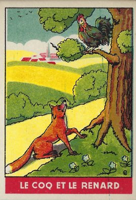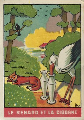 1935? 10 numbered cards out of a series of 48 offering fables of La Fontaine. 2½" x 3¾". Imp. Landouzy Frères Lambersart. Gift of Francoise Camillas, August, '15. 46 of the 48 cards (missing only #46 and #48) for €20 from aubenouvelle through Ebay, July, '21.
