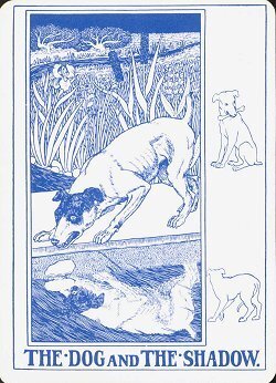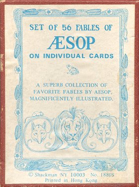 1965? "Set of 56 Fables of Aesop on Individual Cards" A Superb Collection of Favorite Fables by Aesop, Magnificently Illustrated." Illustrations from Percy Billinghurst, not acknowledged. No. 1880S. Printed in Hong Kong. Shackman, NY 10001. Four sets in varying condition, one with a box without a label, another in a box missing one side. $25.07 from JoAnn Jeffreys, Overland, MO, through Ebay, July, '00. $15 from Frank Scott, Elizabeth City, NC, through Ebay, August, '00. $9.95 from Dorothy Buhrman, Cambria, CA, through Ebay, Feb., '01. $20 from Lee Shepherd, Lake Mary, FL, through Ebay, March, '01.
