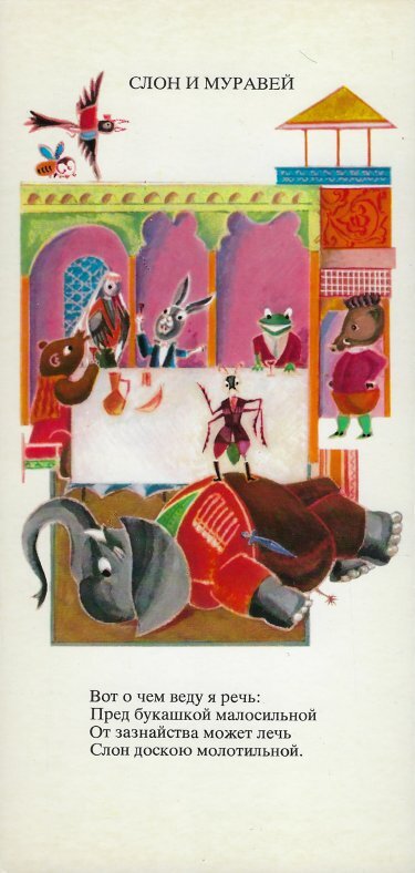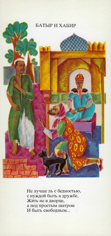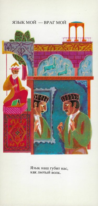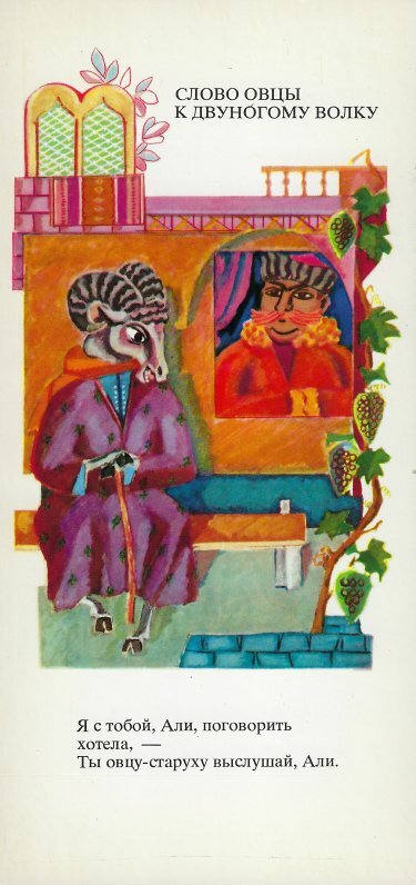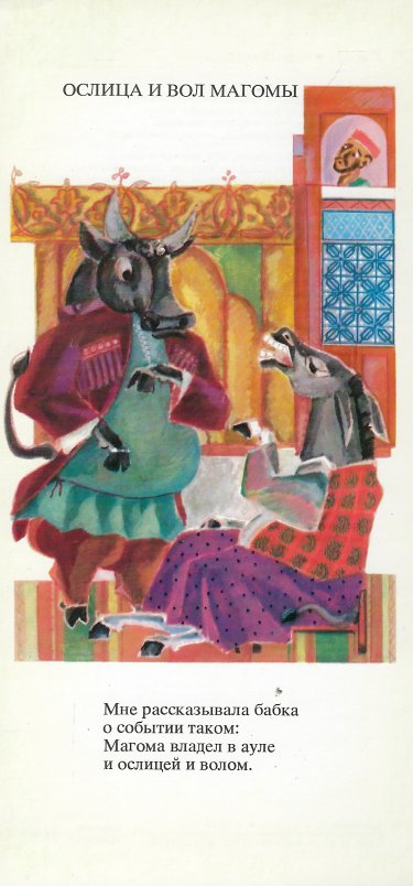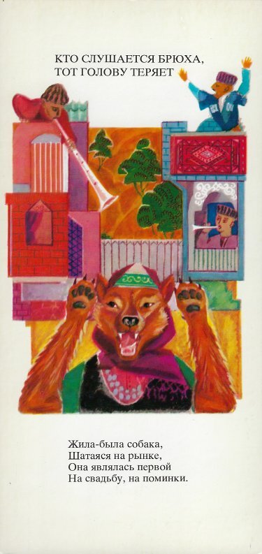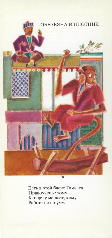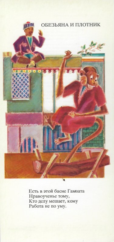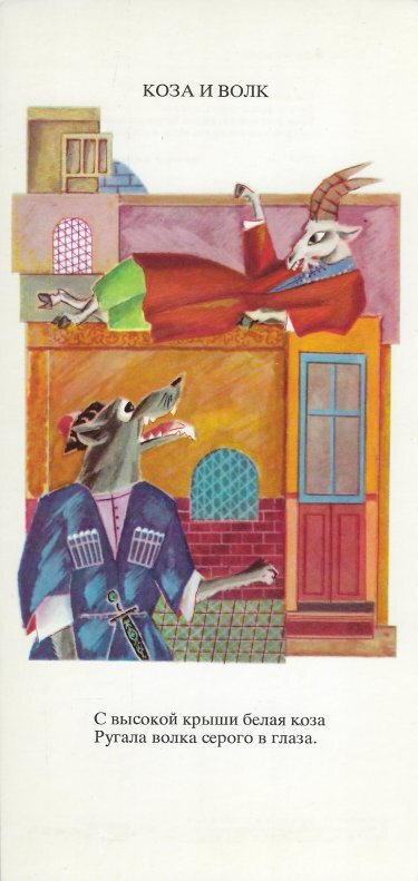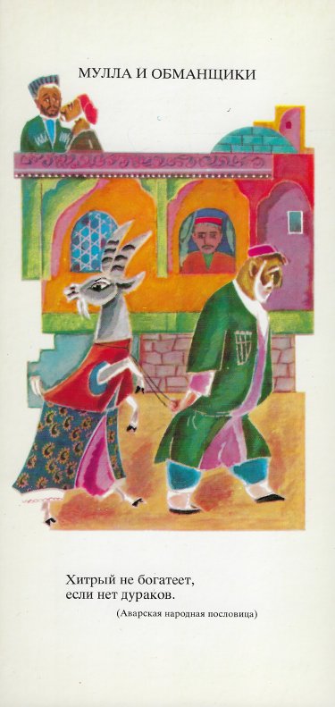 “The first national poet of Dagestan.” Islam, the Revolution, creativity. Wrote poems, fairy tales, and fables for children. I can recognize perhaps five of the fables pictured here. I put them first here. The card size is unusual, with title, colored image, and a few lines on the front and a full text in Russian on the verso. Soon enough, we may be able to use OCR technology to make more sense of the texts. Till then, I have to be happy to enjoy the pictures and wonder about the story! - Date
