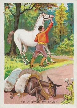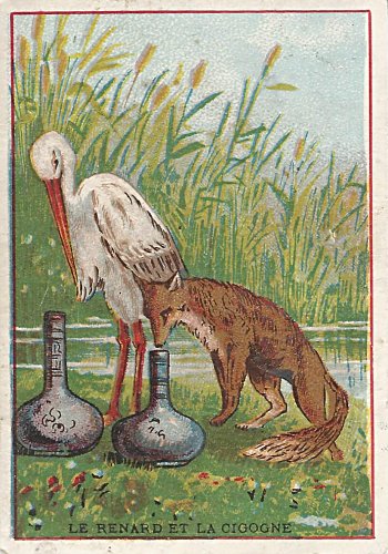 Grouping these two cards together is a sheer guess. Each has only the text of the fable and its title on the verso. The block-print title on the image is larger than the print on the other cards. Two nice looking cards! FS presents a pleasing view of the two animals approaching two tall slim-necked vases. The full text of La Fontaine's FS fable is on the verso. Nothing else is on the verso. It turns out that this card's image is identical with the image -- though not the title font -- on the card in the series by Alcide Picard - Date