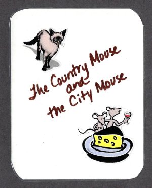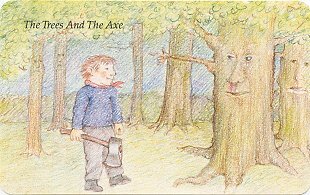 Thirty-six cards, each with a fable printed on one side and a titled colored picture on the other. The style of the illustrations is soft and cute. How one "plays" is not clear. The best illustrations include: "The Wolf in Sheep's Clothing," "The Trees and the Axe," and "The Stork and the Farmer." The lion has not bad breath but the smell of a skunk from a fight. WC adds a phase: "You only saved me for a reward." The spilt milk is kicked over by a cow; the point is that tomorrow is another day. The FS illustration misses the point by having the fox serve solid chunks of food on plates. The cards' packaging changes slightly in the new edition, apparently from 1989. -